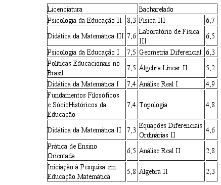 Foram analisadas nove disciplinas em cada um dos grupos – licenciatura e bacharelado – e se identificou que, na licenciatura, a média das médiasfinais em cada disciplina foi superior a 6,0 em oito disciplinas. E mesmo quando essa média das médias foi menor que 6,0, ela foi muito próxima a esse valor, apenas 0,2 pontos abaixo. Já no bacharelado, a média das médias finais foi superior a 6,0 em apenas três disciplinas. Nas demais disciplinas, a distância em relação à média foi de, pelo menos, 0,8 pontos, chegando a atingir 3,7 pontos abaixo dessa média mínima exigida para aprovação. Isso mostra a superioridade de desempenho dos estudantes da licenciatura nas disciplinas específicas do curso, do mesmo modo que reafirma a dificuldade dos estudantes do bacharelado nas disciplinas características da área.