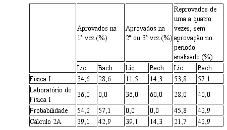 No grupo dos estudantes da licenciatura, na disciplina Física I, 34,6% foram aprovados na primeira vez que a cursaram, 11,5% na segunda ou terceira vez, e 53,8% não obtiveram aprovação, mesmo tendo cursado a disciplina de uma a quatro vezes. Em Laboratório de Física I, o percentual de aprovação na primeira vez foi de 36,0%, e na segunda e terceira tentativas também de 36,0%. Logo, o percentual de estudantes que cursaram a disciplina no período analisado, mas que não foram aprovados, foi menor que em Física I, 28,0%. Em Probabilidade, houve o maior percentual de aprovação na primeira vez em que cursaram a disciplina, 54,2%. Porém, nenhum estudante foi aprovado na segunda ou terceira vez que a cursaram. Desse modo, o percentual de reprovados de uma a quatro vezes na referida disciplina foi de 45,8%. Por fim, em Cálculo 2A, 39,1% foram aprovados na primeira vez que cursaram a disciplina, 39,1% na segunda ou terceira vez que a cursaram, e 21,7% a cursaram de uma a quatro vezes, sem obter aprovação. Com isso, depreende--se que a disciplina em que os estudantes mais têm problemas de aprovação é Física I, que está no fluxo do quarto período do curso.