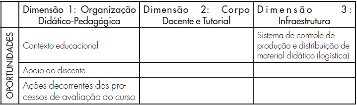 Logo, os Quadros 1, 2, 3 e 4 elencam a análise de SWOT realizada nos relatórios das avaliações in loco dos cursos de graduação da UFPB, através da identificação de forças, fraquezas, oportunidades e ameaças institucionais. Sendo assim, algumas considerações merecem ser enfatizadas a fim de fornecer uma melhor compreensão dos processos relativos à avaliação de cursos.