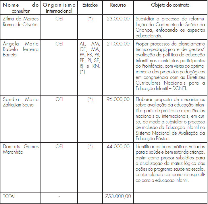 Um terceiro projeto de consultoria previa mecanismos de avaliação da educação infantil, a partir de experiências nacionais e internacionais. Os valores investidos nas três consultorias foram de R$ 163.000,00 (cento e sessenta e três mil reais). Os recursos investidos foram subsidiados a partir do convênio entre o governo brasileiro e a OEI. O quadro 1 apresenta, separadamente, as consultorias, sua abrangência de atuação e recursos destinados.