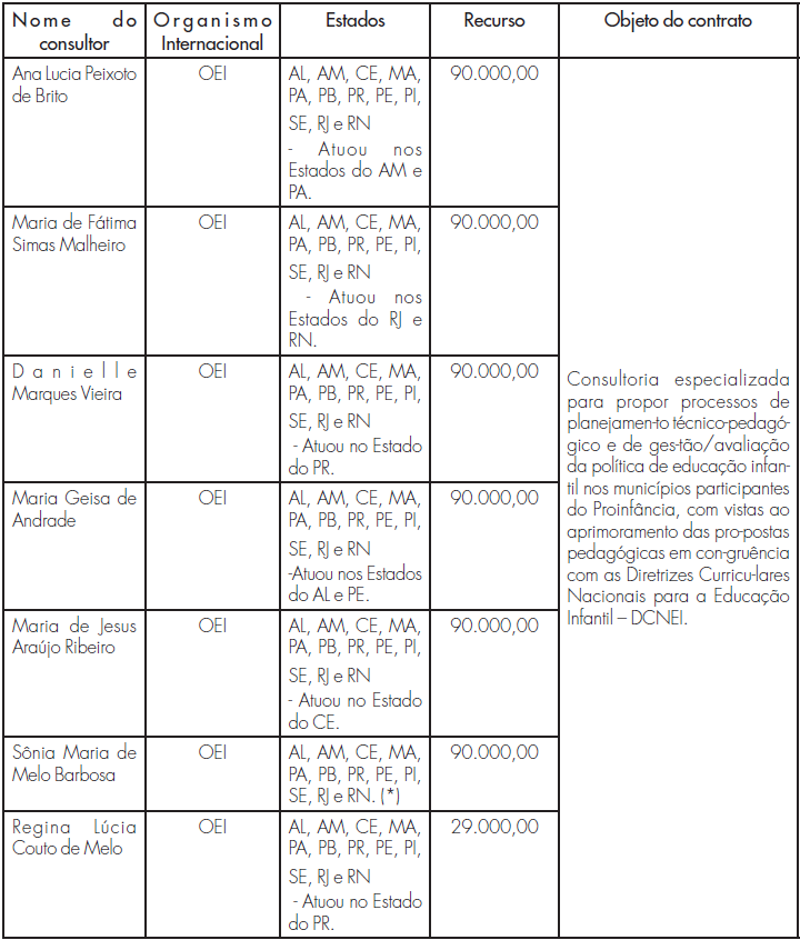 No ano de 2013, foram contratadas 14 consultorias que se propu--seram trabalhar nos processos de planejamento técnico-pedagógico e de gestão/avaliação da política de educação infantil nos municípios participantes do Proinfância para dar continuidade à implantação e ao aprimoramento das propostas pedagógicas em consonância com as DCNEI. O quadro 2 apresenta, separadamente, as consultorias, sua abrangência de atuação e recursos destinados.