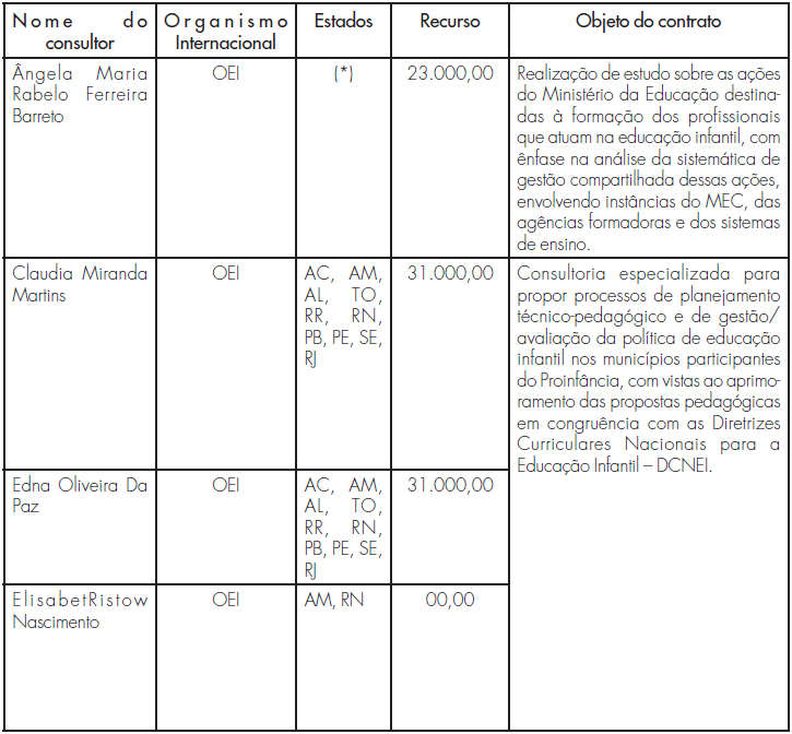 Não foi possível verificar a efetividade do trabalho realizado pelas consultorias na análise do conteúdo. Outrossim, identificamos o montante de recursos investidos na contratação, as empresas contratadas, a proposição de ações de cada consultoria e a área geográfica de atua-ção. A equipe contratada era constituída por intelectuais e ex-integrantes da Equipe COEDI/MEC. De modo geral, os serviços contratados tiveram caráter propositivo, contendo subsídios para o desenvolvimento da qualidade da educação infantil. Outro ponto identificado, e que se constitui numa prática frequente das consultorias, refere-se aos procedimentos generalizantes de gestão apontadospelos consultores. Destarte, nem sempre adequada à realidade dos países periféricos que têm suas especificidades alijadas.
