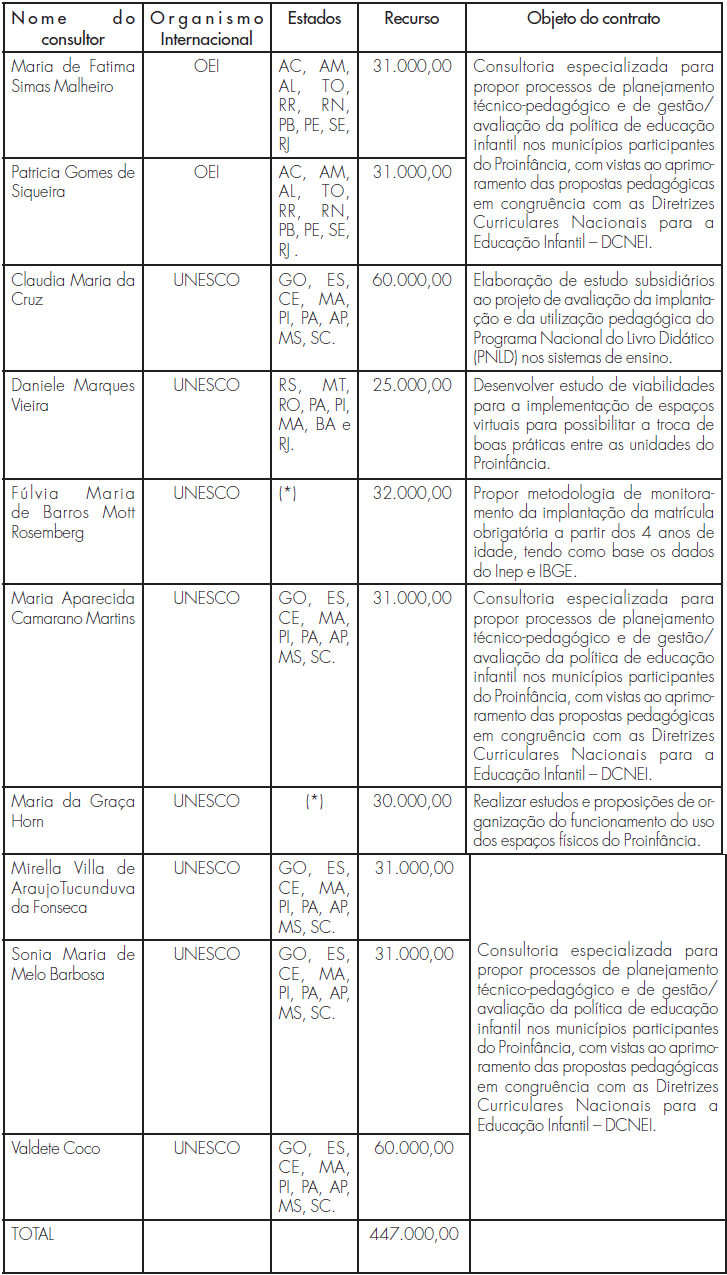 Em 2012, foram contratadas 11 consultorias, que movimentaram recursos na ordem de R$ 753.000,00 (setecentos e cinquenta e três mil reais). As consultorias se propuseram a implantar ações voltadas a atender à Política Nacional de Educação Infantil. Um conjunto de 8 consultorias atuaram em processos de planejamento técnico-pedagógico e de gestão/avaliação da política de educação infantil nos municípios participantes do Proinfância, para a implantação e aprimoramento das propostas pedagógicas em congruência com as DCNEI. Nesse processo, foi investido um montante de R$ 590.000,00 (quinhentos e noventa mil reais). As outras três consultorias se ativeram em outras áreas de atuação, como identificaras boas práticas voltadas para a saúde e bem-estar da criança, assim como propor subsídios para a atualização de dados ao programa saúde na escola e reformulação da Caderneta de Saúde da Criança, com foco nos aspectos educacionais. Tal instrumento contemplaria informações referentes às ações das políticas de saúde, assistência social e educação infantil.