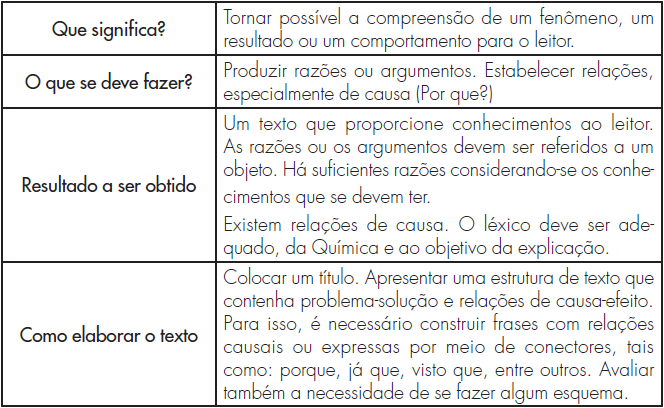 De acordo com Sanmartí (2007), o texto explicativo se caracteriza por ordenar determinados fatos segundo uma relação que, quase sempre, é de causa-efeito. Para Jorba (2000), explicar é apresentar raciocínios ou argumentos estabelecendo relações com base em determinado marco teórico, a partir das quais os fatos explicados ganham sentido e levam a modificar o estado do conhecimento. Márquez (2008) afirma que explicar consiste não só em relacionar os fatos entre si e com as ideias, mas também em produzir razões ou argumentos de maneira ordenada segundo uma relação de causa-efeito.