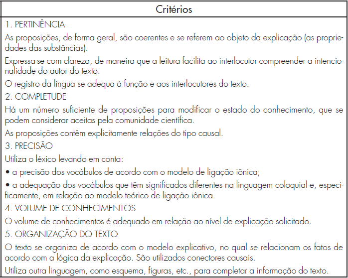 Para a análise das respostas à terceira questão e a determinação dos níveis de desenvolvimento da habilidade explicar, em relação às propriedades do NaCl, foram usados os critérios de avaliação desenvolvidos por Jorba (2000), apresentados no Quadro 2.