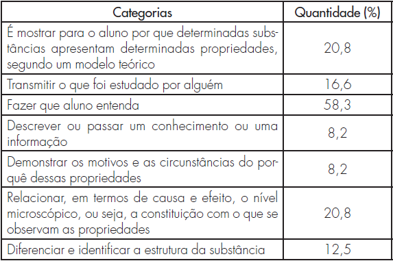 Na prova pedagógica, foi solicitado aos licenciandos expressar o que é explicar cientificamente propriedades de substâncias e de materiais em Química. As respostas categorizadas estão explicitadas no Quadro 3. Como se observa, apenas 20,8% dos licenciandos fazem referência à dimensão causal da explicação, ou seja, relacionam o nível macroscópico (a fenomenologia) com o nível microscópico, como uma das características da explicação científica.
