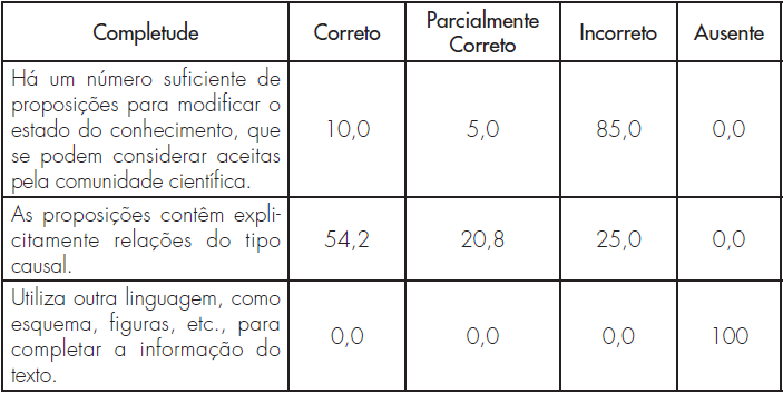 A completude do texto escrito diz respeito à quantidade e qualidade das proposições usadas no texto explicativo. No Quadro 5, observa-se que, no geral, os licenciandos não produzem textos com suficientes proposições que possam dar conta de uma explicação mais completa e satisfaçam as exigências desse tipo de texto, considerando se tratar de um fenômeno multicausal. Por sua vez, embora haja textos de extensão limitada, neles se expressam relações simples de causa-efeito, encontrado nas respostas de 54,4% dos licenciandos.