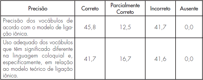 Os licenciandos que não utilizam com precisão os termos próprios da linguagem dos modelos da ligação iônica (41,7%) cometem erros, dentre os quais se destacam: