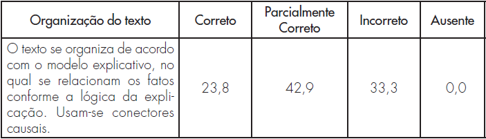 No estudo, os achados coincidem com outras pesquisas, como a de Ebbers e Rowell (2002), Núñez e Ramalho (2015), as quais evidenciaram dificuldades de estudantes para produzir textos explicativos, segundo as proposições de Sanmarti (2000).
