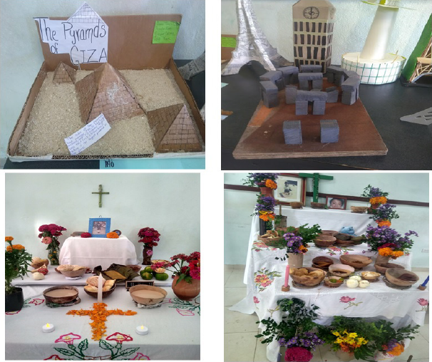 Fotos: 1 e 2) Materiais apresentados por estudantes do 3o ano em uma classe de inglês em setembro de 2018. Fotos: 3 e 4) Altares apresentados pelos estudantes na escola para o concurso do Hanal Pixán.