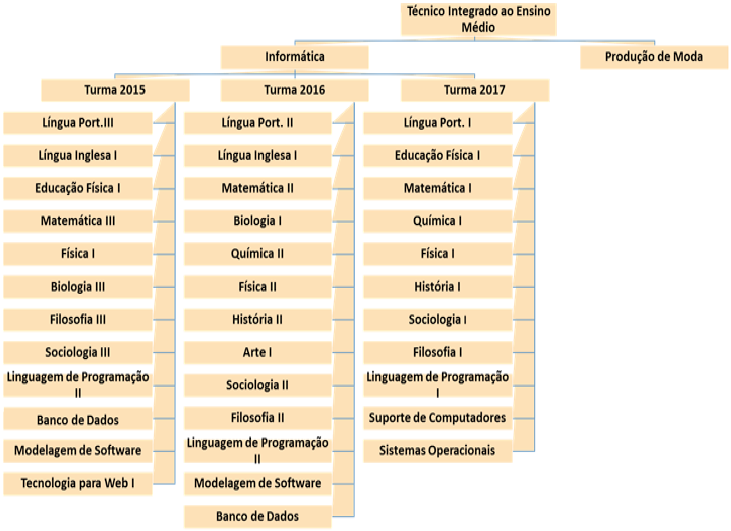 Os cursos técnicos integrados ao Ensino Médio, conforme prevê a Resolução nº 6 de 20 de setembro de 2012, que define as Diretrizes Curriculares Nacionais para a Educação Profissional Técnica de Nível Médio, em seu artigo 3º, destaca que esse nível de ensino pode ser desenvolvido de forma articulada, podendo ser integrada ou concomitante ao Ensino Médio. De acordo com a mesma resolução, em seu artigo 7º, a formação técnica integrada é aquela “ofertada somente a quem já tenha concluído o Ensino Fundamental, com matrícula única na mesma instituição, de modo a conduzir o estudante à habilitação profissional técnica de nível médio ao mesmo tempo que conclui a última etapa da Educação Básica”. Na Imagem 1, podemos observar a organização curricular do curso investigado.
