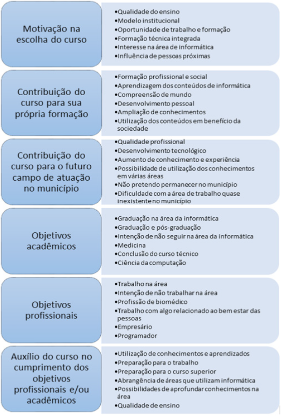 Os resultados dessas análises nos permitem entender que o curso investigado considera os ideais mais amplos expressos pela instituição da qual faz parte. Seus objetivos evidenciam o preparo técnico e profissional na área da informática, além de uma preocupação com a formação humana e social de seus estudantes. Por essas razões, destacamos a importância de se compreender o contexto e os processos sociais que circundam a formação do estudante e que podem influenciar as proposições do curso com base nas percepções.