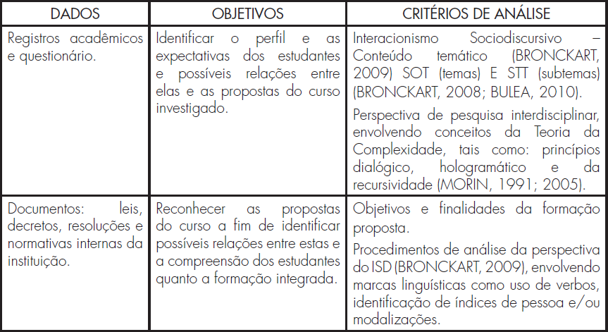Para uma maior compreensão dos procedimentos metodológicos, sistematizamos os instrumentos de coleta de dados, seus objetivos e critérios de análise levando em conta o objetivo mais amplo desse estudo, referente à discussão sobre a formação técnica integrada a partir das relações entre o perfil, as expectativas de estudantes e as propostas do Curso Técnico Integrado em Informática, de um campusdo Instituto Federal do Paraná, conforme Quadro 1.