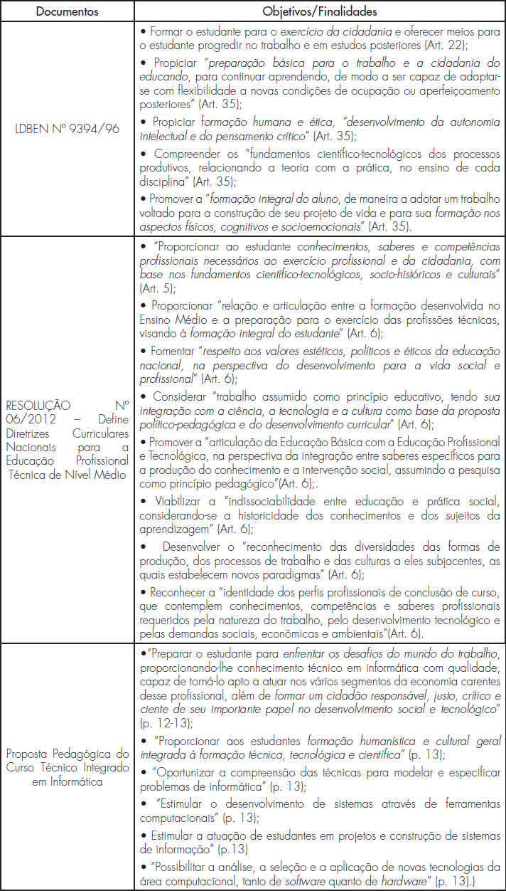 Quanto aos documentos institucionais e às normativas internas da instituição, analisamos os principais documentos que norteiam e orientam as propostas do curso Técnico Integrado em Informática do IFPR – campus Avançado Goioerê. Acessamos as leis, decretos e resoluções que orientam, de maneira geral, o ensino Técnico Integrado no Brasil: os artigos nº 35, 36, 39, 40, 41, e 42 da Lei de Diretrizes e Bases da Educação Nacional nº 9.394 de 20 de dezembro de 1996, Decreto nº 5.154 de 23 de julho de 2004, Resolução nº 6, de 20 de setembro de 2012; e, as normativas internas da instituição: Lei nº 11.892, de 29 de dezembro de 2008 e específico ao curso investigado, o Projeto Pedagógico do Curso Técnico Integrado em Informática. Para a análise desses documentos, selecionamos os objetivos e finalidades da proposta de formação técnica integrada a fim de identificar o que é esperado dos alunos, conforme mencionamos em um dos questionamentos na introdução deste texto.