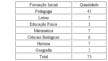 Os professores que responderam aos questionamentos tinham de um a vinte e oito anos de experiências em docência na educação básica. Aproximadamente 70%, entre 1 a 10 anos de atuação docente, e 30%, entre 10 a 28 anos. Esses professores atuavam em diferentes áreas do conhecimento da educação básica, mas a maioria, licenciada em pedagogia, atuava nos anos iniciais. Dentre os setenta e três professores, dois não possuíam pós-graduação lato sensu, os demais eram pós-graduados, vários com mais de uma especialização. Do total de setenta e três, apenas quatro possuíam pós-gradu- ação stricto sensu, em nível de mestrado. Dois com mestrado em Educação e dois com mestrado em Ciências Ambientais.