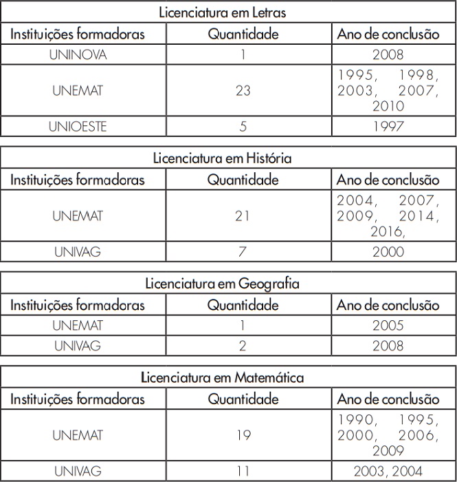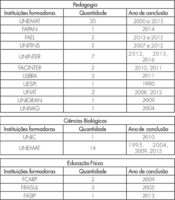 Os professores, colaboradores desta pesquisa, concluíram suas formações iniciais em diferentes instituições, mas a maioria se formou na Universidade do Estado de Mato Grosso (UNEMAT), nas últimas duas décadas, conforme demonstra o Quadro 3.