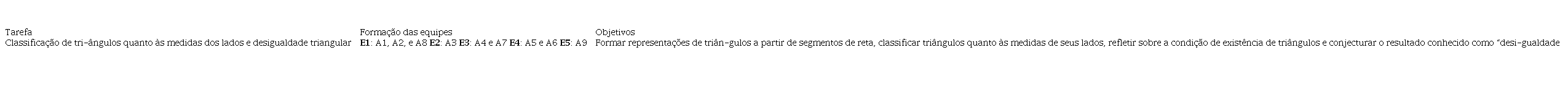 A equipe E3 apresentou uma conjectura textualmente equivocada, pois o conteúdo de sua representação discursiva, escrita em língua natural, evidencia que o “triângulo não existe” quando a soma das medidas de dois de seus lados é maior do que a medida do terceiro lado. Acredita-se que foi uma distração da equipe ao inserir a palavra “não”, pois procurou, em sua conjectura, relacionar as medidas dos segmentos representados inicialmente com a possibilidade de formação de triângulos. Destaca-se que, ao suprimir a palavra “não”, a ideia matemática da conjectura permanece correta, mesmo que a equipe tenha escrito “soma de dois lados”, pois a dificuldade em coor- denar o registro em língua natural, na sua modalidade escrita, para designar os diferentes objetos matemáticos envolvidos pode ter suscitado tal equívoco.