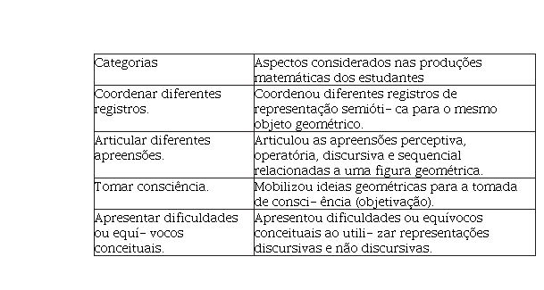 Neste sentido, para este estudo, foram delineadas quatro categorias de análise (Quadro 7), as quais emergiram das interpretações da teoria dos registros de representação semiótica de Duval (2004; 2004a; 2011; 2012; 2012a) e, também, da recolha de dados provenientes deste estudo.