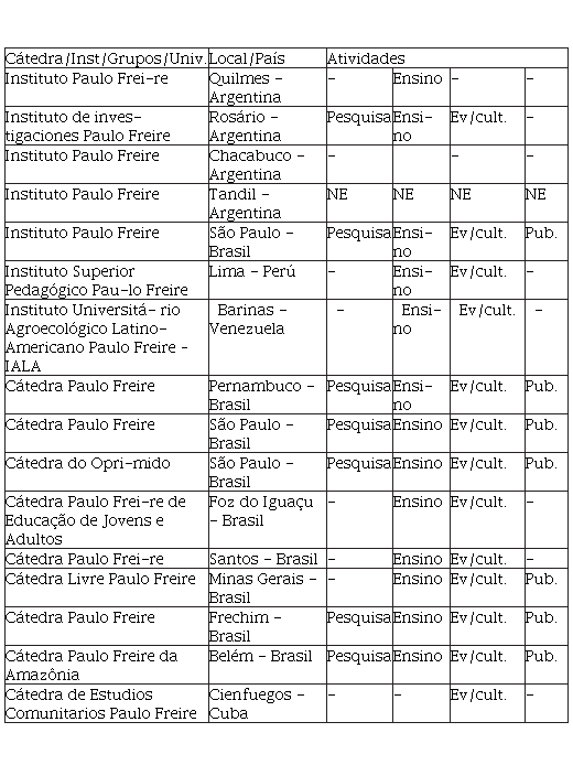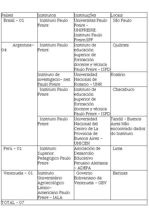Há presença significativa de Paulo Freire nos países da América Latina, principalmente em termos Cátedras e Institutos Paulo Freire. O Brasil possui 08 (oito) Cátedras e 01 (um) Instituto; a Argentina 04 (quatro) Cátedras e 04 (qua- tro) Institutos; a Venezuela 01 (uma) Cátedra e 01 (um Instituto); a Colômbia 04 (quatro) Cátedras; o México 03 (três) Cátedras; a Costa Rica 02 (duas); o Peru 01 (um) Instituto e Cuba e Porto Rico apenas 01(uma) Cátedra. Encontrou-se, também, uma Universidade Paulo Freire na Nicarágua (Quadro 2).
