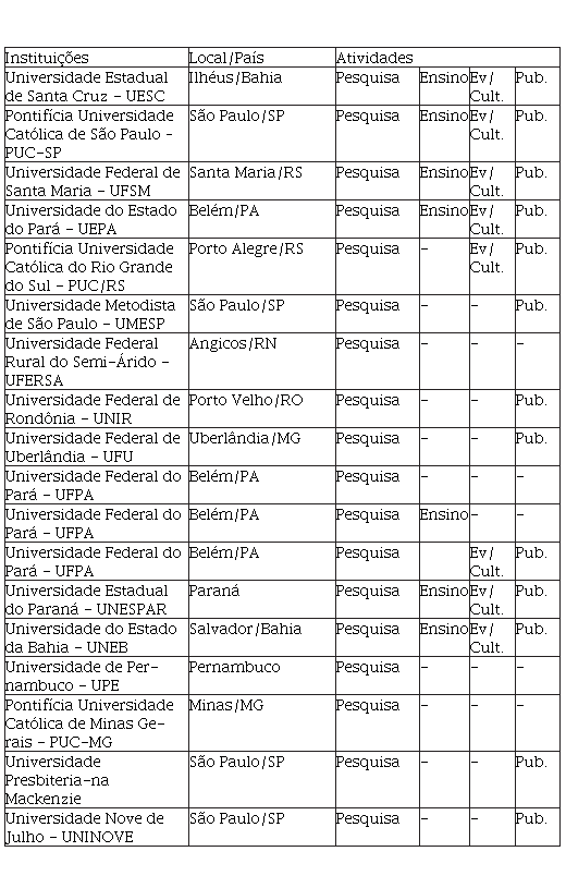Entre as IES que realizam articuladamente pesquisa, ensino, extensão, eventos culturais e publicação estão: Universidade Estadual de Santa Cruz – UESC (Ilhéus/Bahia); Pontifícia Universidade Católica de São Paulo – PUC/SP (São Paulo/SP), Universidade Federal de Santa Maria – UFSM (Santa Maria/ RS), Universidade do Estado do Pará – UEPA (Belém/PA), Universidade Estadual da Bahia (UNEB) e Universidade Estadual do Paraná – UNESPAR (Paranavaí/ PR) e Universidade Federal de Minas Gerais – UFMG. A maioria informa, no descritor do grupo, que realiza, apenas, pesquisa.