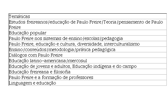 Ademais, temáticas que envolvem estudos sobre o próprio Paulo Freire e sua educação em geral, por temas específicos de sua educação e na aplicabilidade de seu pensamento educacional em sistemas públicos de ensino e em práticas em diferentes contextos socioculturais.