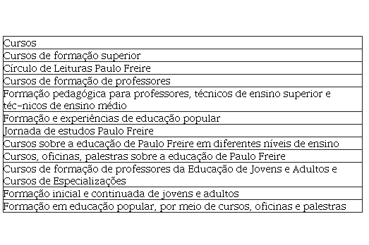 Os cursos ofertados se caracterizam por quatro tipos de formação: (1) pedagógica para professores do ensino médio e ensino superior; (2) de educadores populares; (3) de professores da Educação de Jovens e Adultos e (4) sobre a educação de Paulo Freire. Essas formações são realizadas por meio de cursos, oficinas e palestras (Quadro 12).