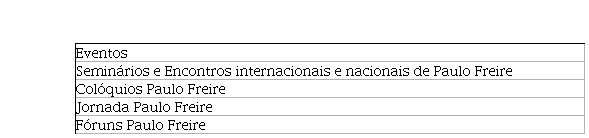 Em termos dos eventos, encontram-se aqueles direcionados para o debate em relação ao pensamento educacional de Paulo Freire, como o Internacional Encontro do Fórum Paulo Freire e outros voltados para a sua obra como pedagogia e teatro do oprimido.