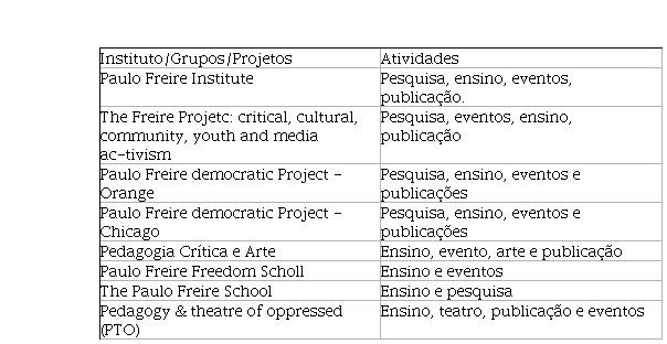Nos Estados Unidos, encontram-se Institutos, Grupos de estudos, Escolas, Projetos e Programas tendo por base o pensamento socioeducacional de Paulo Freire. Diferentemente da América Latina, a referência principal é Paulo Freire e a sua obra, não estando restrita à educação.