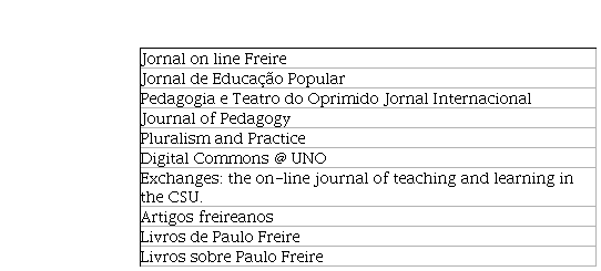 A universidade de Nebraska, em Omaha, possui um jornal chamado “Digital Commons @ UNO”7, no qual são publicados vários artigos, entre eles, muitos relacionados às obras e pensamento educacional de Paulo Freire, inclu- sive de outras universidades.