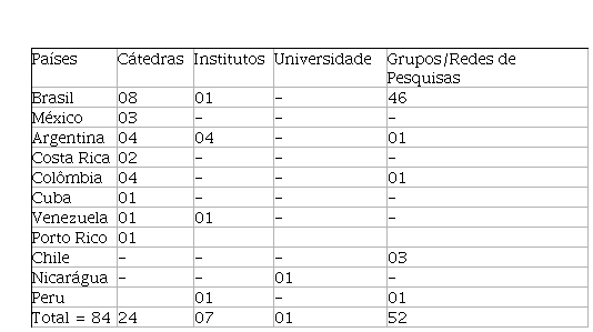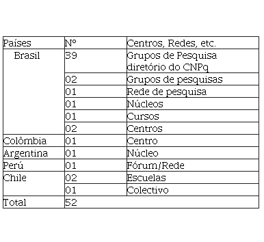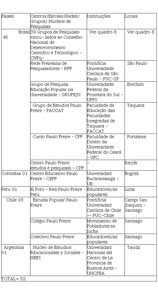 A presença de Paulo Freire, no contexto latino-americano, é significativa por meio dos Institutos, Cátedras, Grupos de Pesquisas e, também, Universidade. Em termos de grupos de pesquisas, a concentração das informações está no Brasil, considerando a existência do Diretório do CNPq, que facilita o acesso às informações.