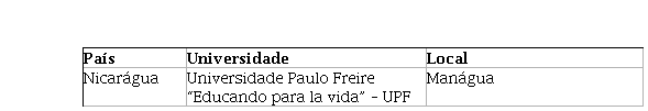 Identificou-se a existência de uma Universidade Paulo Freire, em Manágua – Nicarágua, fundada em 18 de maio de 1998, que se cons- titui em uma Instituição de Educação Superior Humanista, com oferta do ensino das Ciências Jurídicas, Ciências Sociais e Econômicas, Ciências da Educação e de disciplinas como Direito do Trabalho, Direito da Família, Legislação, Gestão e política ambiental. Disponibiliza formação e educação aberta aplicáveis a todos os níveis técnico superior, licenciaturas, especialização e pós-graduação (Quadro 5).