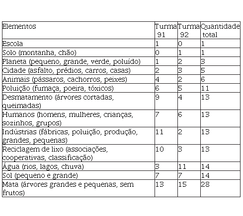 Foram analisados 39 desenhos, 19 da turma 91, e 20 da turma 92. A análise dos desenhos teve início pela identificação dos elementos semelhantes presentes, sendo classificados de acordo com os elementos apresentados; assim, foi possível construir a Tabela 1.