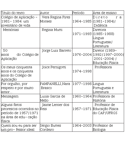Cabe uma consideração a respeito dos possíveis limites deste corpus documental. Trata-se de um conjunto de textos, reunidos em um periódico de caráter memorialístico, idealizado como parte das ações comemorativas pelo aniversário do Colégio de Aplicação da UFRGS. Entende-se que essas pessoas, por diferentes motivos, foram chamadas a registrar suas memórias de estudante/professor. Acreditamos que houve uma escolha institucional dos escritos que fariam parte da edição. Ainda assim, encontrou-se um texto, produzido por Elisabeth Búrigo (2004, p. 176), que fugiu do tom laudatório, comum às demais narrativas. Ela afirma: “[...] no dia do aniversário, contudo, não pude partilhar das referências idílicas ao passado. Escrevi no mesmo dia uma carta a convite da escola como contribuição para o resgate de uma história que não foi só de acertos”.
