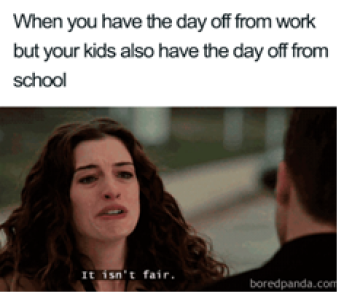 No meme apresentado logo abaixo, o efeito de humor é produzido na situação em que a mãe tem um dia de folga do trabalho e os filhos não têm aula na escola. Como resposta a esse cenário, a mulher relata que essa situação não é justa. A imagem escolhida aparentemente foi retirada de uma cena dramática, tendo em vista que a personagem parece chorar. É possível notar que as escolhas na construção do meme foram estratégicas para produzir humor a partir de uma cena que, originalmente, é comovente. Por outro lado, a relação entre as frases e a imagem pode fazer surgir sentidos diversos a depender de cada leitor-autor.