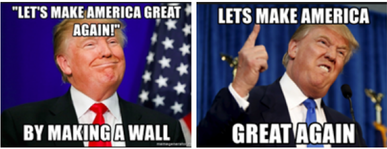 Dentre as análises empreendidas, destacamos dois memes da internet envolvendo Donald Trump, o atual presidente dos Estados Unidos. O slogan de campanha “Vamos fazer a América grandiosa novamente” e a decisão de construir um muro separando os Estados Unidos do México foram apropriados por lados opositores ao governo como forma de ironizar as posturas do presidente. Tanto o slogan de campanha quanto a construção do muro EUA/México estão entre os pontos mais criticados por parte da população estadunidense (e também de outros países) atualmente. A utilização desses memes em aulas de Língua Inglesa possibilitaria análises críticas e discussões sobre questões políticas, de apropriação e ressignificação de discursos, além do estabelecimento de leituras variadas em sala de aula.