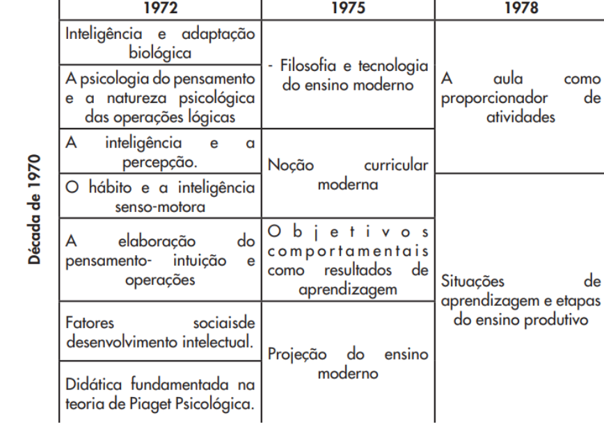 Ao verificarmos a expressão dos conteúdos ao longo do curso de Pedagogia, identificamos que, no início da década de 1970, a proposta do ensino de Didática adota uma abordagem de ênfase Psicológica, valorizando a aprendizagem com base nas teorias piagetianas. Estão listados como conteúdos: inteligência e adaptação biológica. A psicologia do pensamento e a natureza psicológica das operações lógicas; a inteligência e a percepção; a inteligência e a percepção; o hábito e a inteligência senso-motora; a elaboração do pensamento – intuição e operações; fatores sociais de desenvolvimento intelectual; didática fundamentada na teoria psicológica de Piaget.