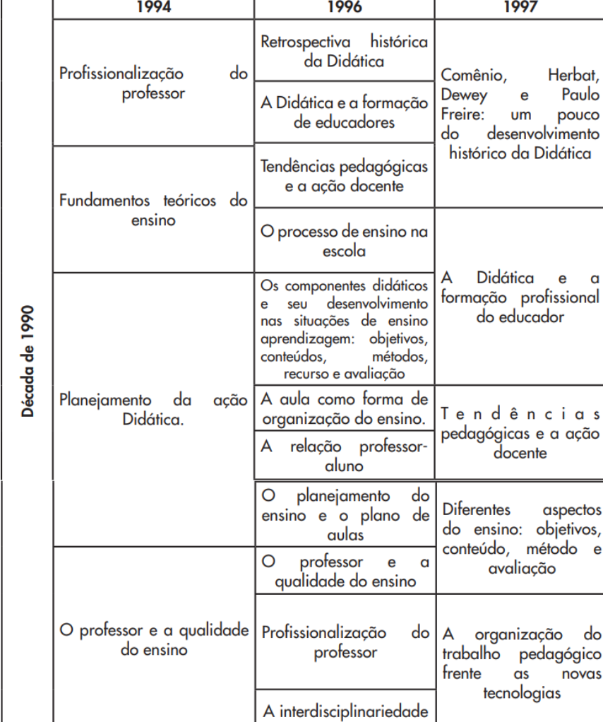 A Didática, nesta perspectiva de abordagem na profissionalização do professor, está expressa na listagem de conteúdos de 1994: profissionalização do professor; fundamentos teóricos do ensino; planejamento da ação Didática; o professor e a qualidade do ensino. A indicação desses conteúdos relativos à formação e profissionalização do professor estão presentes nos anos de 1996 a 2018, em todos os programas. No entanto, a partir do programa de 1996 foram propostas: tendências pedagógicas e a ação docente; o processo de ensino na escola; os componentes didáticos e seu desenvolvimento nas situações de ensino aprendizagem: objetivos, conteúdos, métodos, recursos e avaliação. A isso se acresce: a relação pedagógica professor, aluno, conhecimento e os diferentes aspectos de ensinar e aprender, ou seja, não só os elementos da composição do ensino, mas os sujeitos professor e alunos. Ainda, como conteúdo comum em todos os programas a partir de 2008: o conhecimento didático e suas relações com as demais áreas do conhecimento.