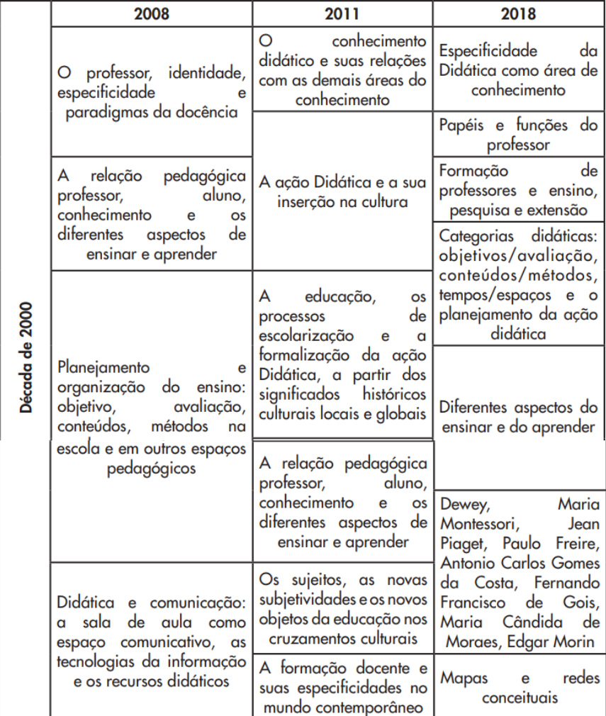 Nas listagens de 2008 a 2018 aparecem conteúdos que não se repetem nos demais anos: a ação Didática e a sua inserção na cultura; os sujeitos, as novas subjetividades e os novos objetos da educação nos cruzamentos culturais; mapas e redes conceituais. No programa de 2008: didática e comunicação: a sala de aula como espaço comunicativo, as tecnologias da informação e os recursos didáticos. E, em 1997 e 2018, alguns teóricos da Didática e em alguns programas a aula como item do conteúdo. Desse modo, o ensino e a formação e profissionalização do professor se constituem itens de conteúdos presentes em todos os programas nestas três décadas, portanto, uma Didática com abordagem no ensino e na profissionalização do professor. No entanto, destacamos que o trabalho com a construção histórica do processo de ensino compreende autores clássicos e novos autores que problematizam a organização do trabalho pedagógico do professor como Herbart, Dewey, Maria Montessori, Jean Piaget, Paulo Freire, Antonio Carlos Gomes da Costa, Fernando Francisco de Gois, Maria Cândida de Moraes, Edgar Morin” (UFPR, 2018).