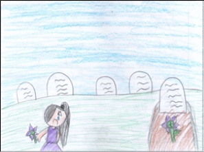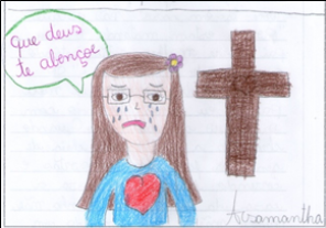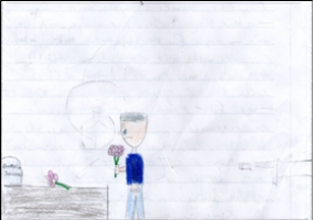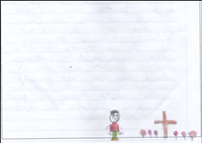 O desenho 1 ilustra o texto ‘Minha avó’, cuja narrativa, em primeira pessoa, menciona a lembrança de uma avó que a menina só conheceu através das histórias contadas pela sua mãe, comentadas pela afirmação de que “eu fiquei muito triste porque nunca conheci a minha avó e porque ela queria ver seus netos crescendo”; o texto também ressalta a dimensão religiosa ao mencionar que, quando a autora vai à igreja, “rezo a Deus que a minha avó esteja num lugar melhor”. A cena desenhada traz a imagem de uma menina com expressão de tristeza e lágrimas, ao lado de um túmulo, e as flores mimetizam a homenagem mais tradicional aos mortos em nossa civilização ocidental.