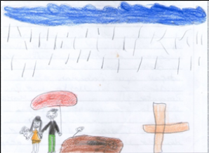 Já o desenho 2 ilustra o texto de caráter mais ficcional ‘A menina preocupada’, anteriormente analisado, que narra o enterro da “mamãe” após “2 dias” de sua morte e a companhia do pai que teria retornado da guerra. O desenho retrata o pai e a filha de mãos dadas, numa possível visita ao túmulo da mãe no cemitério, demonstrando que ao final a filha e o pai “ficaram felizes para sempre” (conforme o texto escrito). Chamam a atenção os detalhes que compõem as cenas: as lágrimas da menina (cuja presença será comentada adiante, em conjunto com o desenho 5), as cores utilizadas e a chuva, elementos representativos de cenas tristes, possivelmente pertencentes ao repertório imagético da autora.