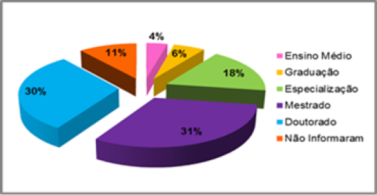 Os dados do gráfico 1 permitem identificar que os níveis stricto sensu e lato sensu apresentaram o maior percentual de titulação dos agentes elaboradores – 31% são mestres, 30% são doutores e 18% são especialistas. Em menor número, temos os formados no ensino médio (4%) e os graduados (6%). A ausência da informação acerca da titulação dos agentes foi identificada em 11% dos currículos Lattes analisados. Os resultados assinalam que a formação dos agentes elaboradores dos PDIs dos Ifets investigados se deu, em sua maioria, com alcance de 79%, em nível de mestrado, doutorado e especialização. Em relação a esse aspecto, cabe ponderarmos que a titulação nesses três níveis constitui um elemento valorizado nos processos de seleção via concursos públicos para o ingresso na carreira de docente nos institutos. Além disso, partimos da hipótese de que o elevado percentual de agentes elaboradores com titulação de mestre e doutor advém dos resultados obtidos com a política de incentivo à qualificação dos servidores dos Ifets. A obtenção de uma titulação stricto sensu qualifica os agentes elaboradores dos PDIs nos debates, na defesa dos argumentos e nas tomadas de decisão no campo educacional, tanto pela qualificação acadêmica que essa titulação representa, quanto pela possibilidade que ela abre de uma articulação numa rede de relações e de ações socializadoras e potencializadoras. Isso se deve ao fato de que o acesso aos níveis mais avançados de escolarização possibilita aos agentes detentores desse capital cultural institucionalizado uma maior aquisição de lucros simbólicos no campo (BOURDIEU, 2007).