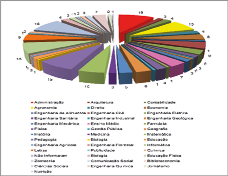 Em relação à área de formação inicial dos agentes elaboradores dos PDIs, identificamos que predominaram os cursos pertencentes às grandes áreas Ciências Humanas, Ciências Exatas e Ciências Agrárias. Como podemos visualizar no gráfico 2 a seguir, o grupo geral desses agentes foi constituído por 19 Administradores, 18 Pedagogos, 15 profissionais das áreas de Informática e Agronomia, dez Matemáticos, nove licenciados em Letras e nove Engenheiros Elétricos. Essa diversificação na área de formação inicial dos agentes elaboradores evidencia uma especificidade no campo de atuação dos Ifets: a integração e a verticalização da educação básica à educação profissional e superior (art. 6.º, Inciso III da Lei n.º 11.892, de 29 de dezembro de 2008). Tal especificidade tem um impacto na composição do quadro funcional dos servidores admitidos para o exercício de múltiplas atividades em âmbito institucional.