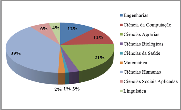 A partir dos dados obtidos por meio dos currículos Lattes, identificamos que 46% dos agentes elaboradores dos PDIs integram grupos de pesquisa e 45%, não possuem qualquer vínculo. Observa-se, no gráfico 3 a seguir, que, dos agentes que possuem vínculo, 39% concentram-se na área de Ciências Humanas e 21% nas Ciências Agrárias. Um dos elementos primordiais para a vinculação dos pesquisadores a grupos de pesquisas está no envolvimento com as atividades de pesquisa científica e/ou tecnológica e a produção do conhecimento (CNPq, 2019). Esse aspecto se coaduna com a produção científica dos agentes elaboradores dos PDIs e constitui um demarcador da posição ocupada por eles enquanto pesquisadores no campo científico (BOURDIEU, 2004).