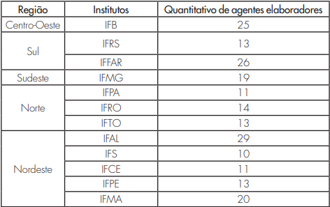 Inicialmente, convém informarmos as estratégias adotadas para traçar o perfil acadêmico e profissional dos elaboradores dos PDIs dos 12 Ifets pesquisados. Para isso, foram estabelecidas três etapas distintas e complementares. A primeira fase foi realizada por meio do levantamento e da consulta aos PDIs dos Ifets pesquisados. Essas duas ações possibilitaram a verificação dos parâmetros que estruturaram os processos de elaboração desses documentos, bem como a identificação dos agentes elaboradores. Na tabela 1, destacamos o quantitativo de agentes por institutos pesquisados nas cinco regiões do país. Ao todo, foram identificados 204 agentes elaboradores. O maior quantitativo verificou-se no IFAL, e o menor, no IFS – ambos pertencem à região nordeste.