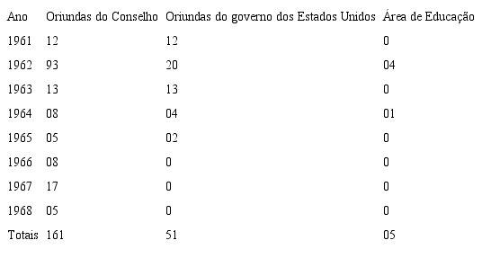 A nossa terceira consideração se apresenta face ao contexto amplo A política externa dos Estados Unidos no período da Guerra Fria foi a base para a criação de diversas instituições e programas como a Aliança para o Progresso, o BID, a USAID, dentre outras. Ora, as três instituições forneceram recursos e bolsas de estudos ao Conselho que os repassou para diversos países latino-americanos. Nesse sentido, estamos realizando uma investigação nos relatórios do Grupo de Trabalho da Reforma Universitária criado em 1968 e, de forma cuidadosa, nas ações e escritos de Rudolf Atcon e Meira Mattos. O nosso objetivo é buscar aproximações e possíveis interferências das recomendações do Conselho no que ficou consubstanciado na Lei 5.540 de 1968 – a lei da Reforma do Ensino Superior no Brasil. Voltando aos nossos questionamentos: seria possível imaginar que Conselho mirasse em objetivos distintos das instituições citadas? Mas, outra pergunta se faz necessária: se o Conselho tinha os mesmos objetivos gerais do conjunto de instituições como a Aliança para o Progresso, o BID, a USAID, por que houve o esquecimento dessa instituição na historiografia da educação brasileira?