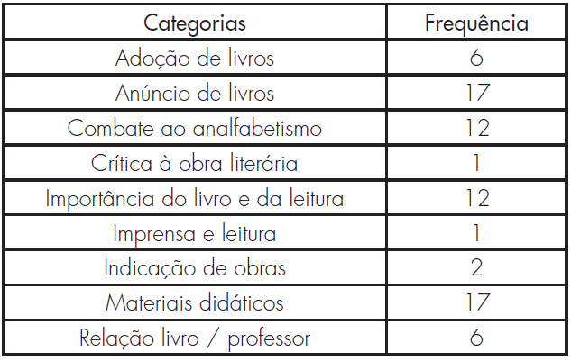 No total, foram identificadas onze categorias relacionadas ao livro e à leitura. Entretanto, não existe uma regularidade no seu aparecimento nos jornais, uma vez que uma mesma notícia poderia apresentar diversas categorias, assim como a mesma informação poderia aparecer repetidas vezes no mesmo jornal, como era o caso do anúncio de livros e de materiais escolares.