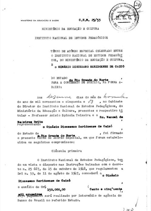 No dia 19 de novembro de 1953, foi firmado o Termo do Acordo Especial (abaixo do texto do Decreto), celebrado entre o Instituto de Estudos Pedagógicos (representado pelo professor Anísio Spínola Teixeira) e o Ginásio Diocesano Seridoense de Caicó (representado pelo Sr. Manoel Medeiros Brito) na concessão do auxílio de CR$150,000,00 (Cento e Cinquenta Mil Cruzeiros) para a ampliação e melhoria dessa instituição de Ensino Secundário Católica. Em face da relevância do referido Decreto e do Termo do Acordo Especial para a História da Educação no Brasil e no Rio Grande do Norte, é que se publica nesta Seção de Documento.