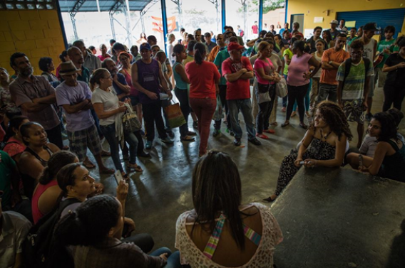 Ao observamos a fotografia que segue, percebemos na parte inferior a presença de aproximadamente trinta e três pessoas reunidas em um grupo com aparência jovem, dispostas em forma circular. Enquanto na parte superior, do lado direito, são visualizados cartazes na parede amarela; em outra, no canto oposto, estão uma porta e uma janela azuis.