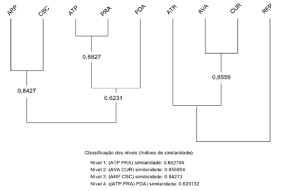 A árvore hierárquica destaca a associação entre as categorias “Articulação Teoria-Prática” (ATP) e “Práticas Orientadas e Reconstruídas” (PRA), com alto índice de similaridade (0,882794), mostrando que as análises produzidas nos trabalhos sobre os cursos aproximam essas duas categorias, ou seja, em boa parte dos textos que tratam de articulação teoria-prática, também é abordada a prática orientada e reconstruída na sala de aula dos(as) estudantes.