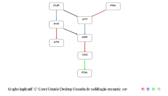O tratamento estatístico implicativo, segundo Almouloud (2008), expressa uma rede de relações causais entre as categorias, permitindo a identificação de caminhos implicativos, que, aqui, denominaremos de trajetórias de aprendizagem. Essas trajetórias serão analisadas, incluindo as ramificações evidenciadas no grafo implicativo, considerando os valores de confiança de 0,90; 0,85, 0,80 e 0,70. Conforme Almouloud (2008), um valor de confiança aceitável para as análises deve ser maior ou igual a 0,50.